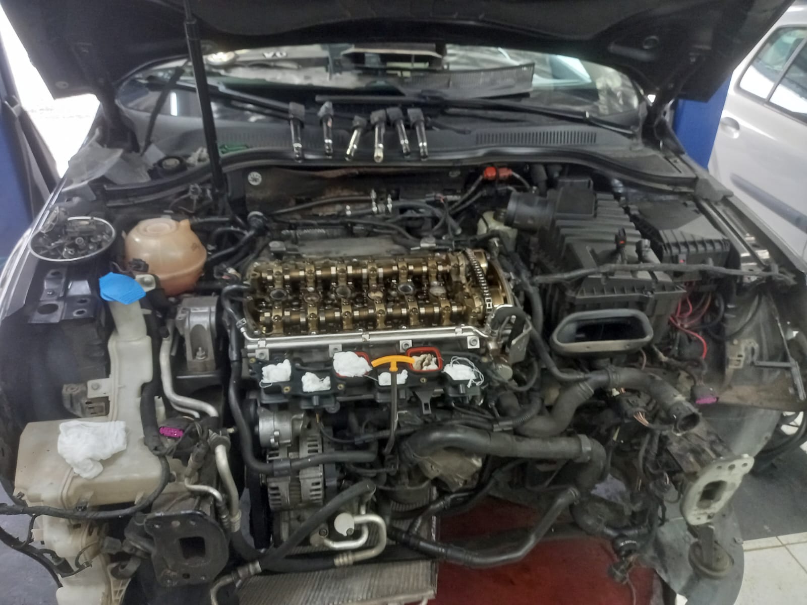 Essa semana realizamos uma manutenção preventiva no Volkswagen Passat VR6 de um cliente. O veículo apresentava vazamento na junta da tampa de válvulas e vazamento de água no radiador, porem para ter acesso ao radiador do Passat VR6 é necessário remover praticamente toda a frente do veículo. O resultado é um serviço com bastante mão de obra.